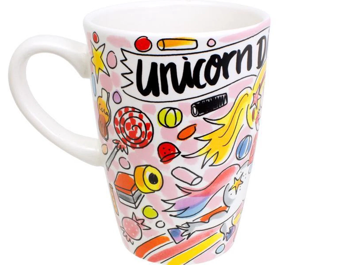Made with magic! Deze heerlijk grote beker van Blond Amsterdam staat vol met vrolijke regenboogkleuren. Op de beker staat een meisje met een unicorn afgebeeld omringd door snoep.