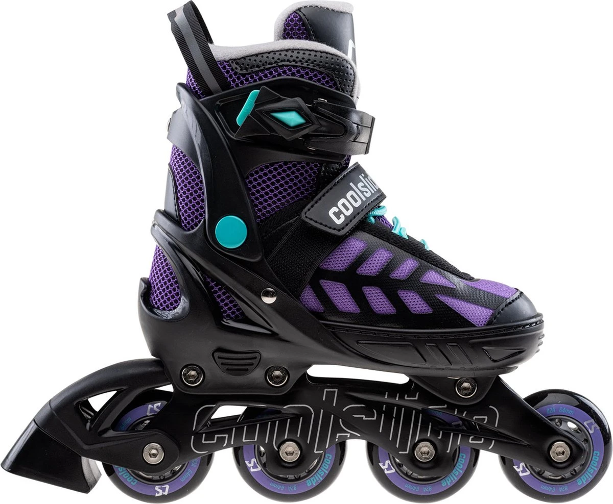 Specificaties: Pasvorm: Let op! Deze skates vallen erg klein. Bestel 2 maten groter dan je normale maat. (Maat 38? Ga dan voor maat 40-43 i.p.v. maat 37-40) Geschikt voor: kinderenSchoen: semi-softboot, geeft veel steun aan de enkel en zit toch comfortabel/ ventilerend bovenwerk/ verstelbaar in 4 maten Sluiting: hoge snelsluiting, wreefband met klittenbandsluiting en een vetersluiting Frame: polypropyleen Hardheid wielen: 82A: medium harde wielen voor een mooie combinatie van snelheid, demping en duurzaamheid Lagers: ABEC 7 kogellagers Afmeting wielen: Maat 33-36: 64mm – Maat 37-40: 72mm – Maat 40-43: 76mm Rem: ja Maximaal gebruikersgewicht: 60kg Kleur: zwart – paars – lichtblauw Materiaal: synthetisch materiaal – textiel – aluminium