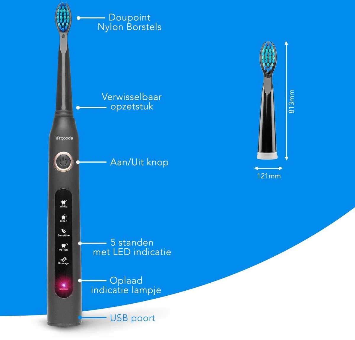 Last van gevoelige tandvlees of gelige tanden? De revolutionaire vibrerende technologie reinigt het gebit doorgrondig en snel. Kies uit 5 standen voor een soft, hard of medium poets ervaring. Geniet dankzij LifeGoods elektrische tandenborstel van een gezonder, sterker en witter gebit! Laad de tandenborstel eens per 3 weken op zonder oplaadstation met de meegeleverde stroomadapter.